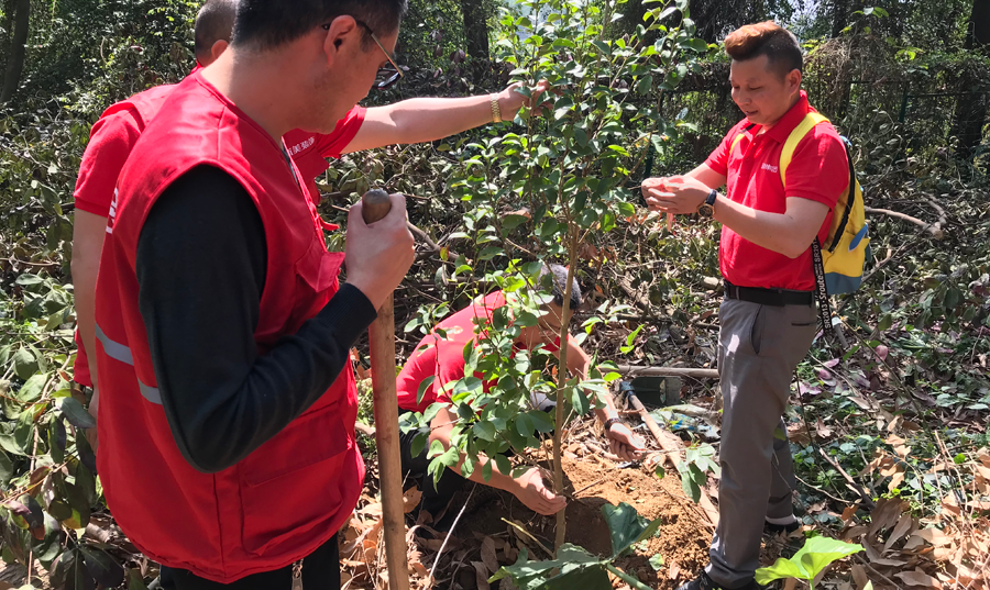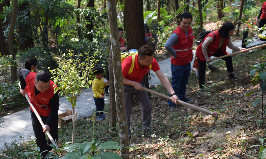 植樹區,一片紅色的身影在這里攢動。有的手扶樹苗,有的揮鋤培土,有的搬運樹苗,密切配合,分工協作,有條不紊地種植樹木,現場呈現一片熱火朝天的勞動景象。