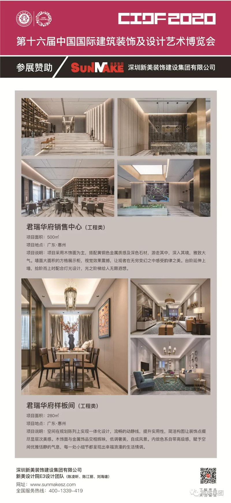榮譽(yù)見證品牌力量!由深圳新美裝飾建設(shè)集團(tuán)有限公司施工的“惠州君瑞華府銷售中心&樣板房”項目,經(jīng)專家委員會評審和組委會綜合評定,最終斬獲“2020第十六屆中國國際建筑裝飾及設(shè)計藝術(shù)博覽會華鼎獎”精品工程獎,并榮獲“2019-2020年度中國建筑裝飾行業(yè)最具商業(yè)價值設(shè)計機(jī)構(gòu)”的殊榮。