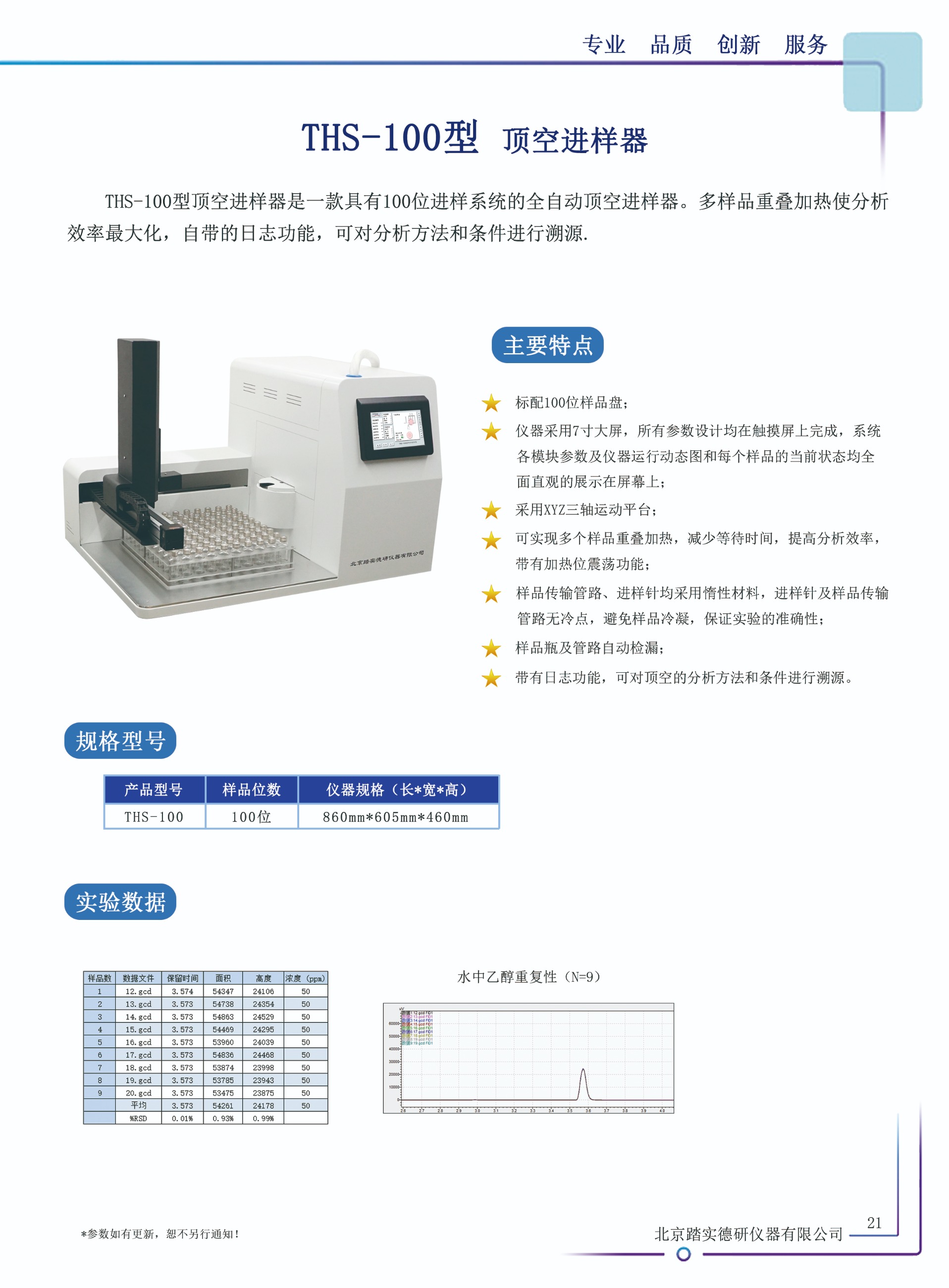THS-100型頂空進樣器是一款具有100位進樣系統的全自動頂空進樣器。廣泛應用于醫療衛生,環保,石油化工,食品行業,制藥等領域。該儀器符合HJ 736-2015土壤和沉積物揮發性鹵代烴的測定 頂空氣相色譜-質譜法》、《HJ 741-2015 土壤和沉積物  揮發性有機物的測定 頂空/氣相色譜法》、GA/T 842-2019  血液酒精含量的檢驗方法》、《HJ 1067-2019水質 苯系物的測定 頂空/氣相色譜法》、《HJ 810-2016水質揮發性有機物的測定 頂空氣相色譜-質譜法》等標準。